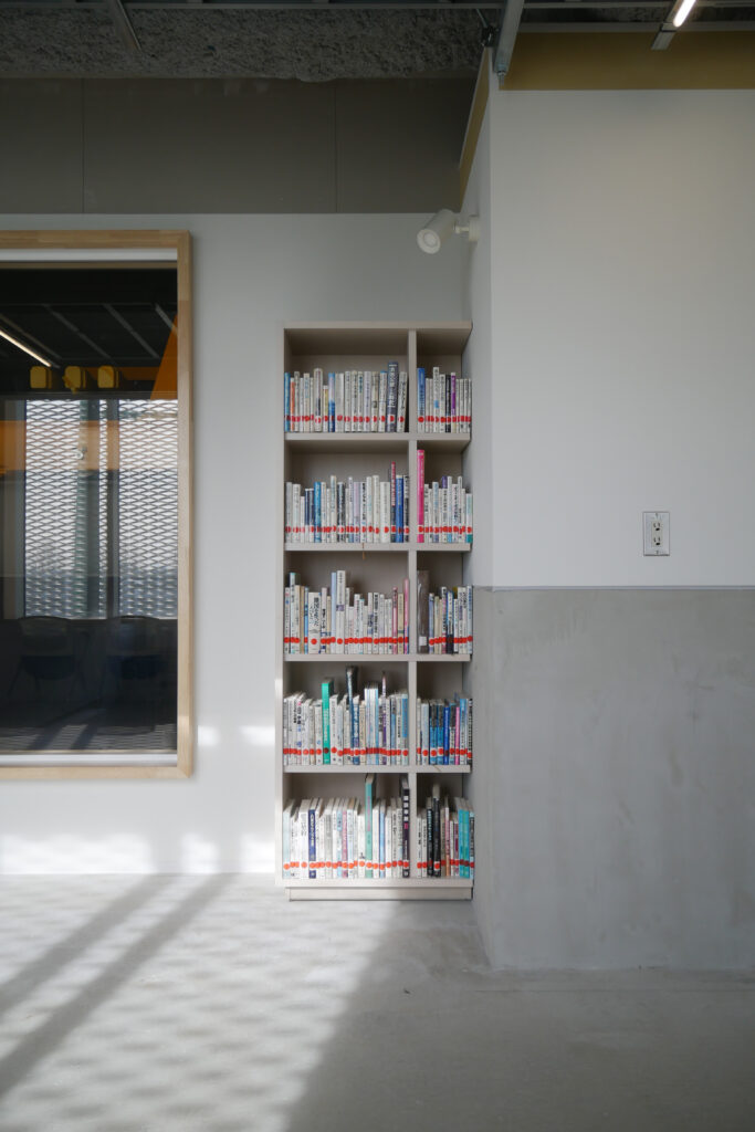 The bookshelf on the other side of the building has been designed without the side panels to show the columns, creating a clean and uncluttered impression.