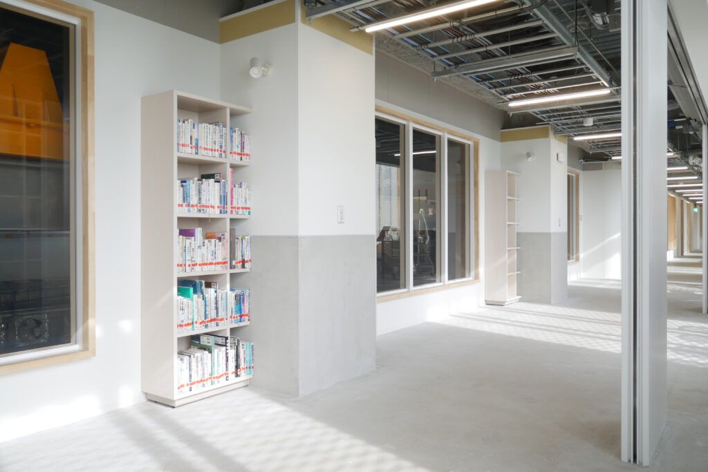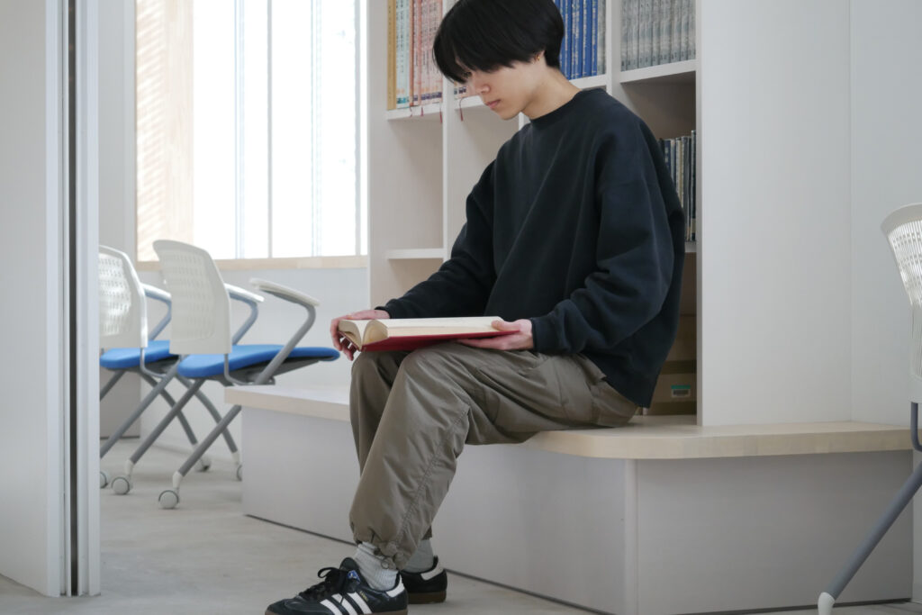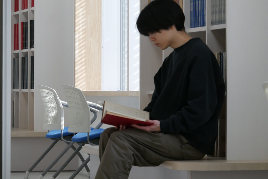 The bookshelf on the ground side has a bench-like lower part where students can sit and read books.