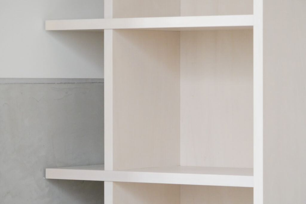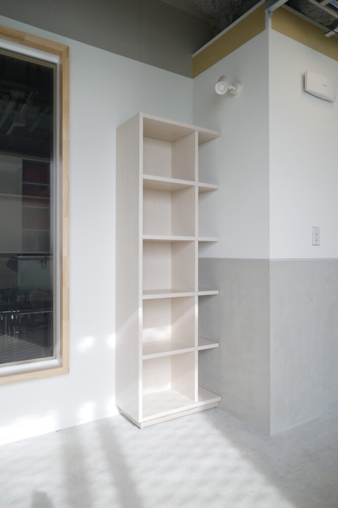 もう片側の本棚は、柱側の側板をなくすことで柱を見せ、すっきりとした印象にしています。