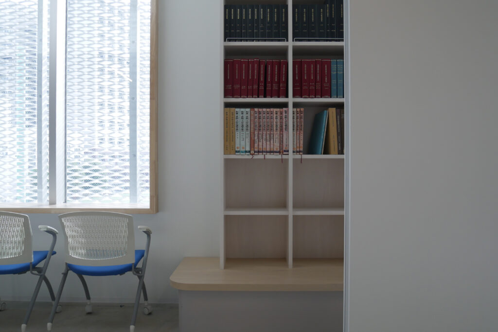 The bookshelves are placed on both sides of the long, narrow, corridor-like space at an appropriate distance from the windows and pillars, creating a rhythmical elevation.